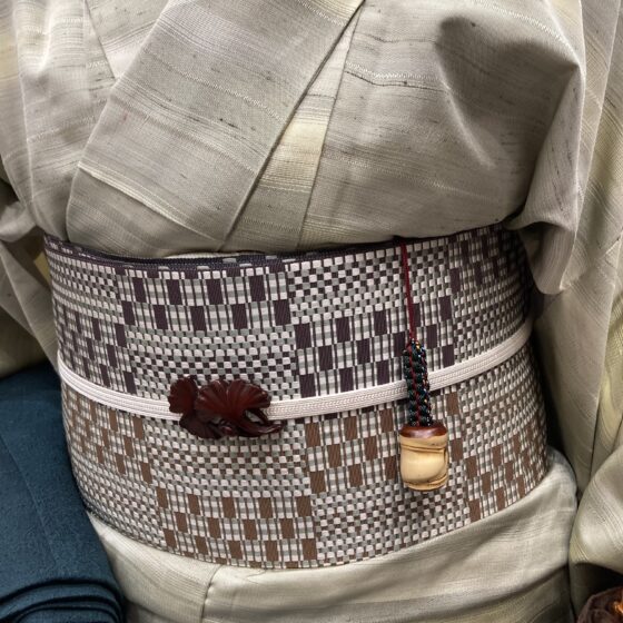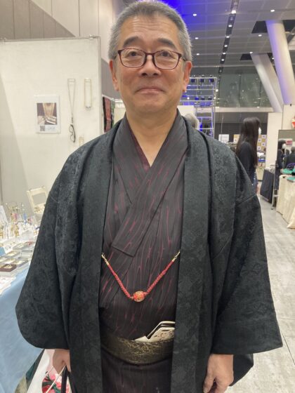 以前、ご購入いただいた竹節の根付けを帯にさして、ご夫婦揃って着物でお越しくださいました。