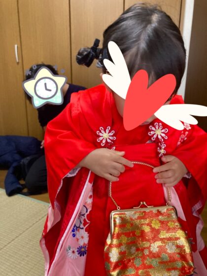 こちらのお嬢ちゃま、伊達締めに描かれた唐子に興味津々。
